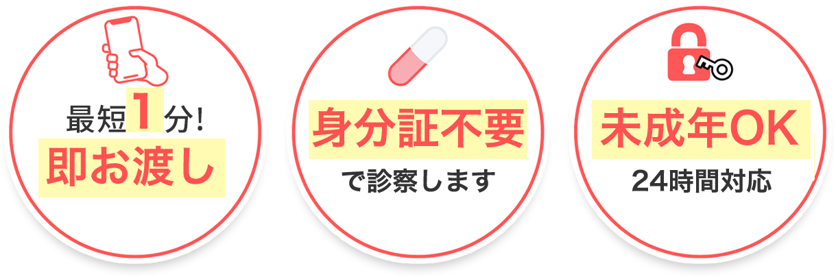 - 診察には身分証など一切不要。個人情報の持ち込みを排除することで、会社や学校など第三者に知られる心配がありません。誰にも気づかれずに来院から処方まで完了できる、プライバシー重視のサービス設計です。